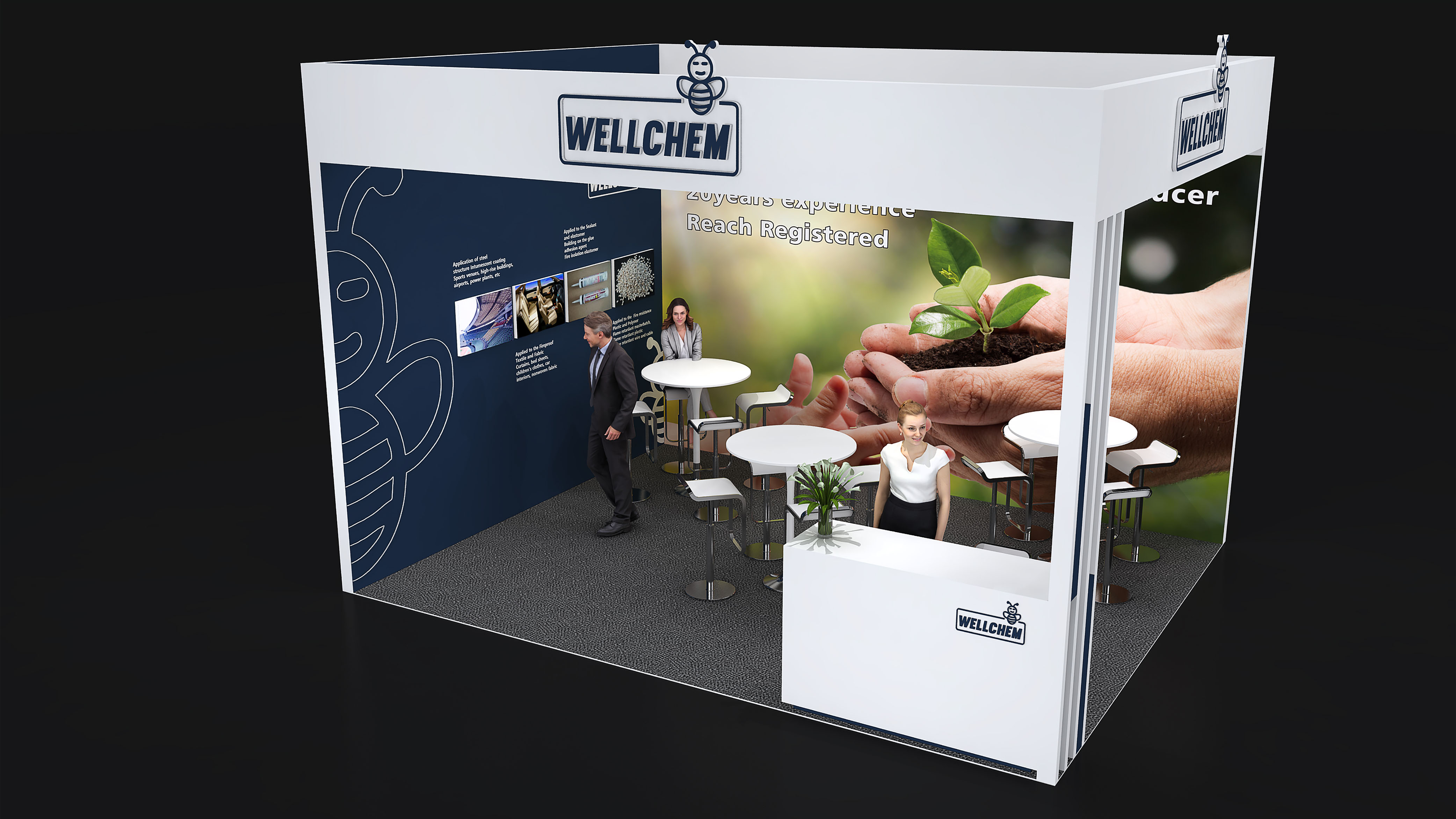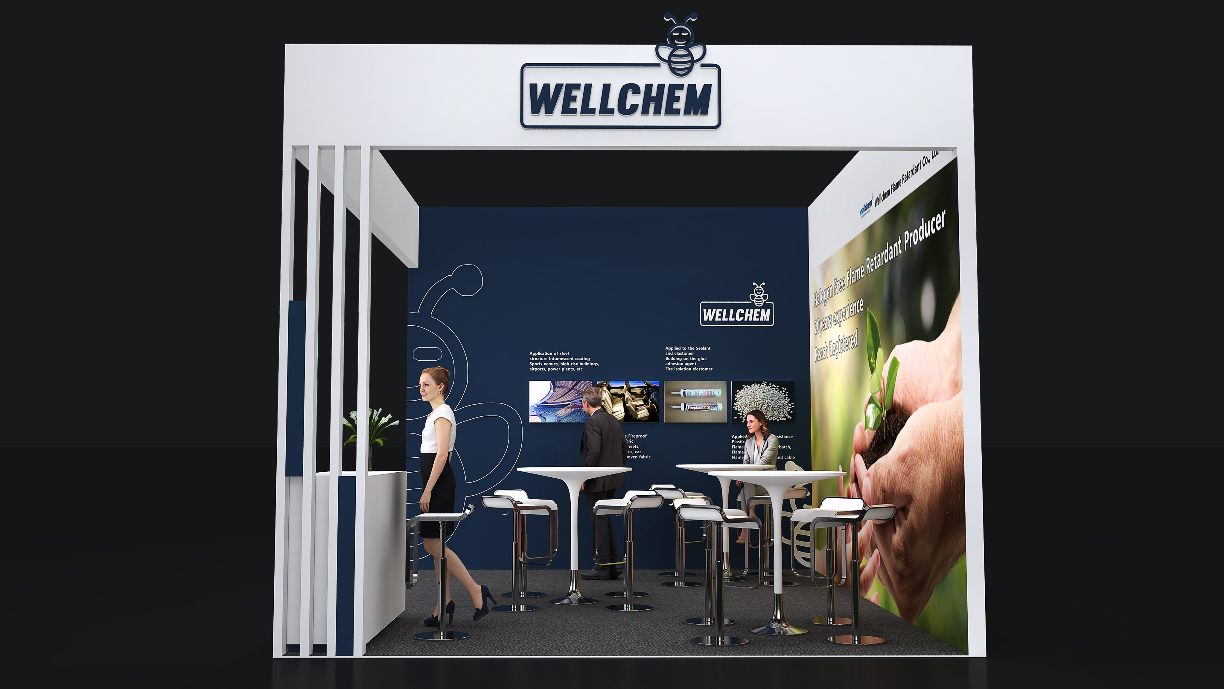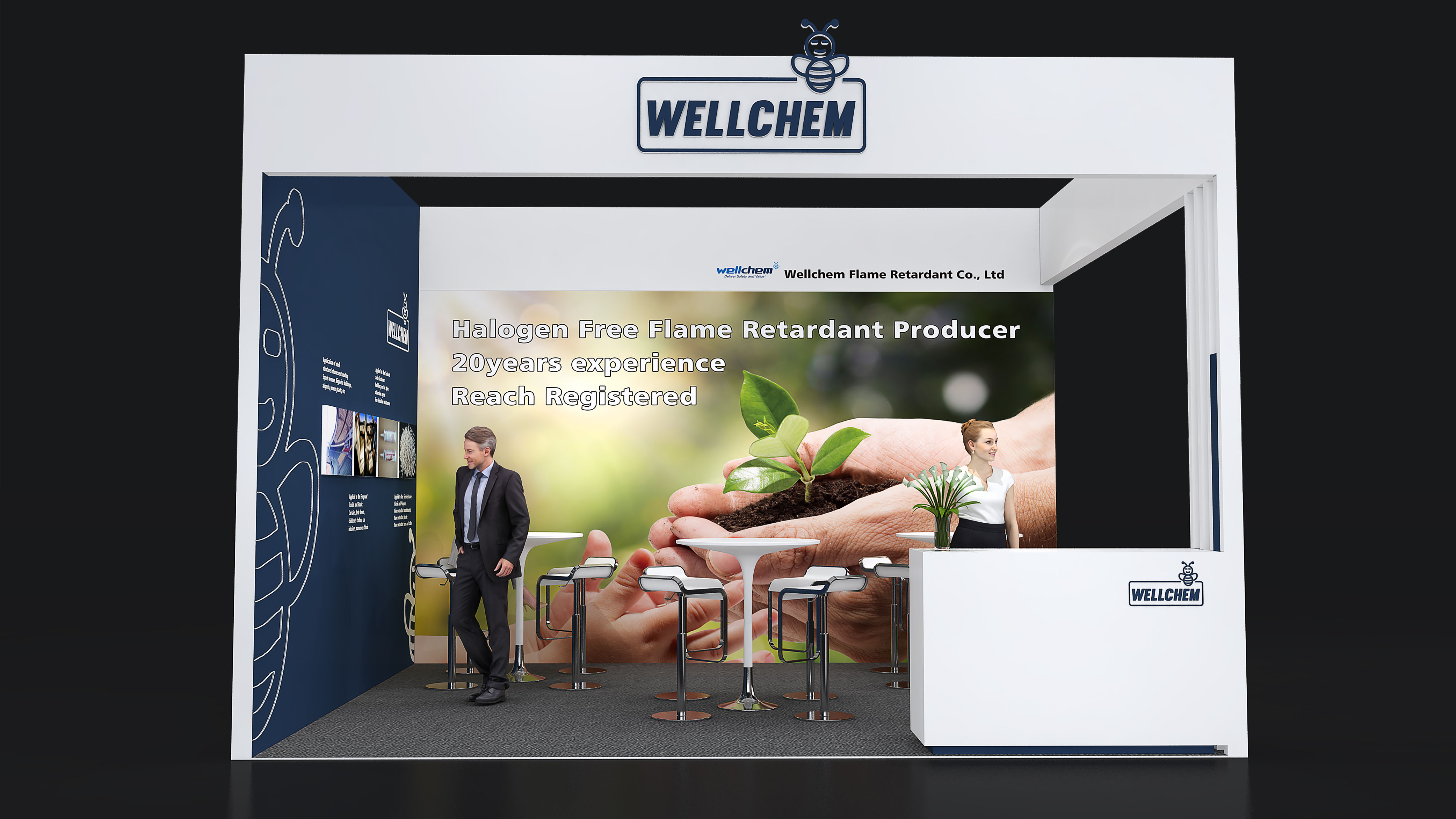 衢州衛(wèi)凱化工有限公司位于國家循環(huán)經(jīng)濟(jì)示范基地衢州綠色集聚園區(qū),園區(qū)內(nèi)有巨化集團(tuán)等著名化工企業(yè),為園區(qū)內(nèi)企業(yè)提供豐富的基礎(chǔ)化工原料和各類化工專業(yè)人才。衢州衛(wèi)凱化工有限公司是繼德國Clariant和Budenheim之后世界第三“結(jié)晶II型高聚磷酸銨(n>1000)”的生產(chǎn)和服務(wù)商,在膨脹型防火涂料,塑料,紡織阻燃劑等領(lǐng)域具有重要的國際市場地位。公司獨(dú)立開發(fā)和生產(chǎn)的(烷基)次磷酸鹽系列產(chǎn)品和三嗪類成炭劑是目前最前沿的革新產(chǎn)品,為了緊隨德國Clariant和意大利Italmatch致力于推動市場發(fā)展,衛(wèi)凱化工在展臺設(shè)計(jì)搭建方面也確實(shí)下足了功夫。