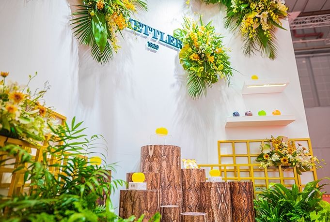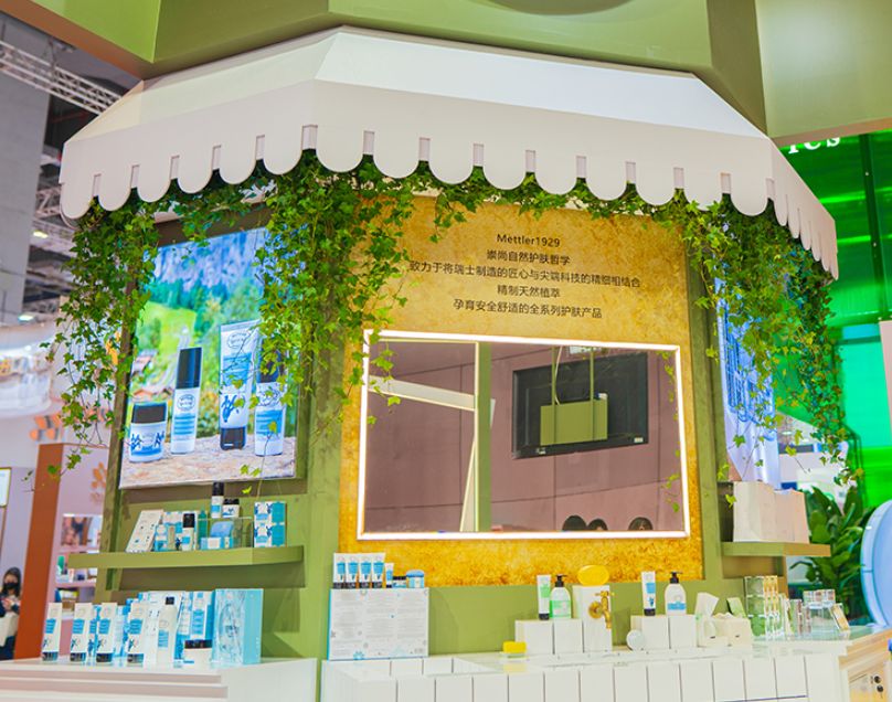 中勵展覽為了體現(xiàn)瑞士百年護膚品牌Mettler1929“萃自天然”理念,在展臺設計裝修方案中使用了大量稀缺的天然植物,如:紫羅蘭、天堂鳥、火焰蘭、山里紅、洋甘菊、情人草、跳舞蘭、洛新婦等等,還請來了專業(yè)的花匠按照品牌調(diào)性剪配植物,最終呈現(xiàn)了精致格調(diào)、天然去雕飾之展臺效果,獲得品牌方稱贊。